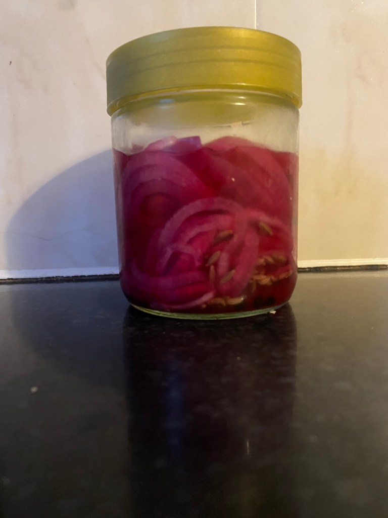 · When all the sugar has dissolved, pour it over the red onions and let it cool in the fridge.